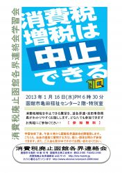 消費税廃止函館各界連では、函館社保協と合同で、消費税増税と社会保障改悪に反対する道南集会を今月の22日(土)午後2時〜千代台公園で開催します。
