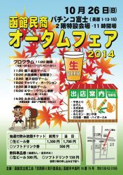 函館民商では10月26日(日)に、美原のパチンコ富士2階特設会場におきまして、午前11時から午後3時まで「民商オータムフェア」を開催します。